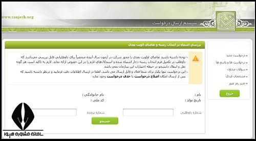 در این قسمت شما باید اسم آزمون سراسری که در اون شرکت کردین، به همراه سال کنکور رو وارد میکردین و بعد گزینه جستجو رو میزدین و سپس بررسی اشتباه در انتخاب رشته و تقاضای اولویت بعدی رو انتخاب میکردین.